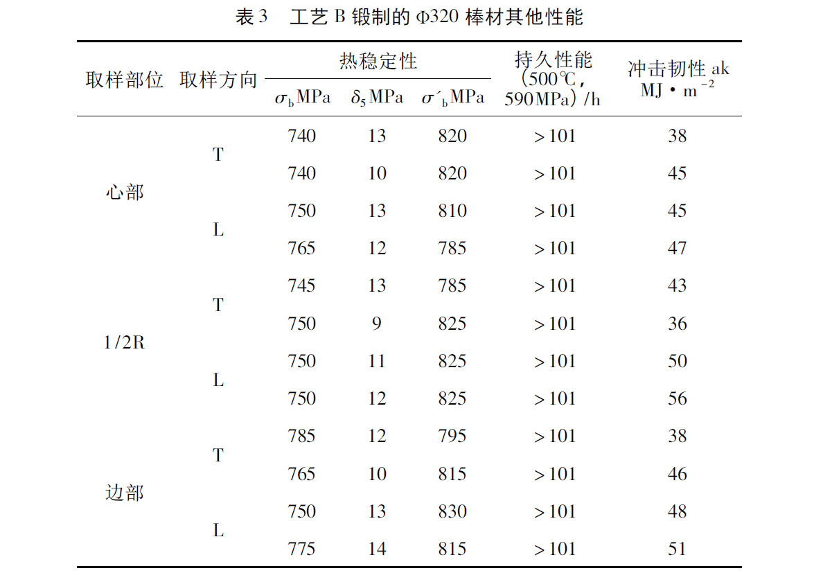 從表1、表 2 可以看出,工藝B鍛制的φ320mm大規格棒材室溫力學性能和500℃高溫力學性能明顯高于工藝A鍛制的φ280mm大規格棒材。分析原因為工藝B的變形量高于工藝A,各個部分的變形更充分,組織更細小。而細小組織可以起到細晶強化的作用。由表3 可以看出工藝B鍛制的φ320mm大規格棒材熱穩定性、高溫持久和沖擊性能都達到了一定的標準要求。